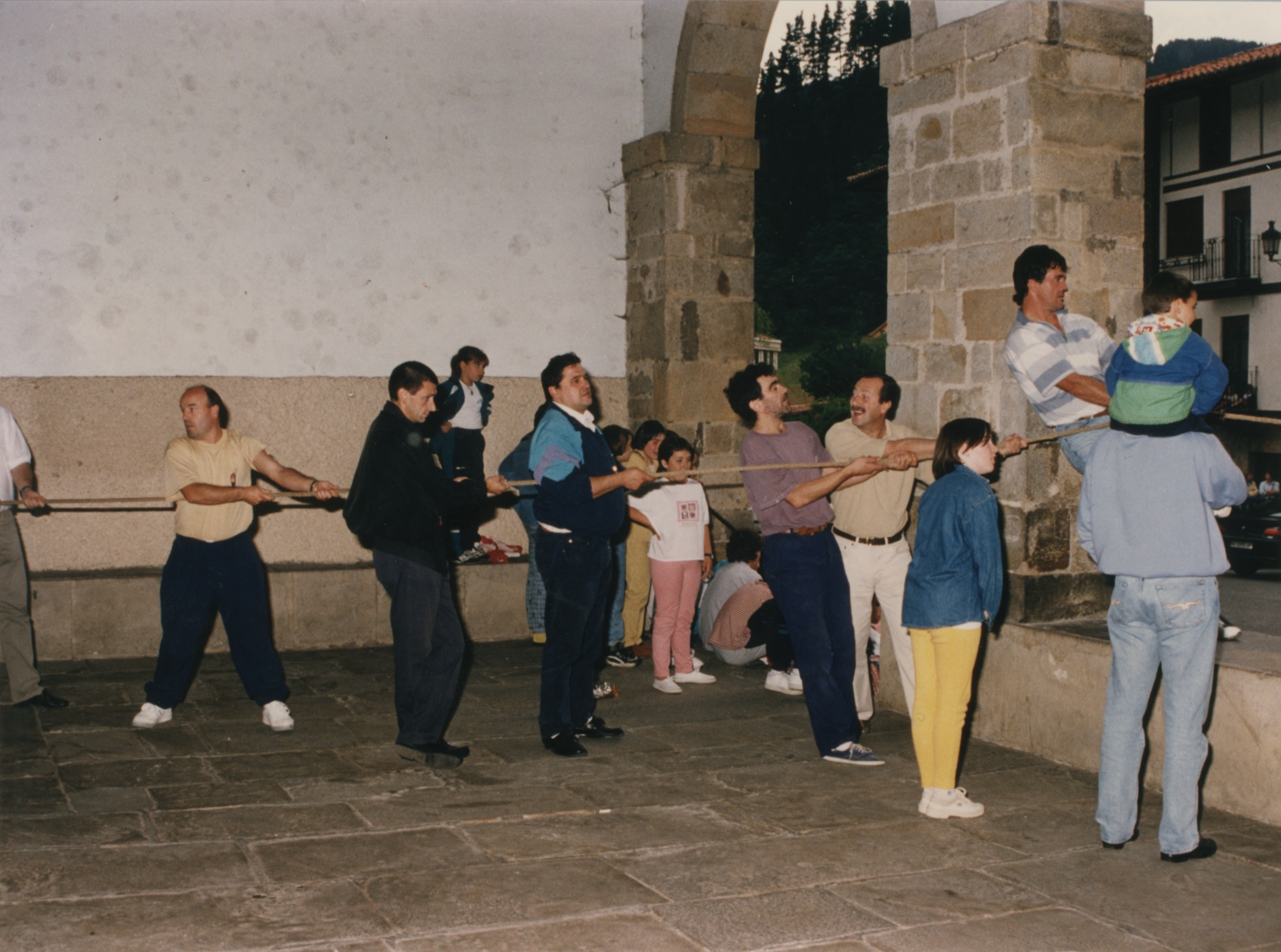Herritarrak eliza azpian San Juan arbolari tiraka