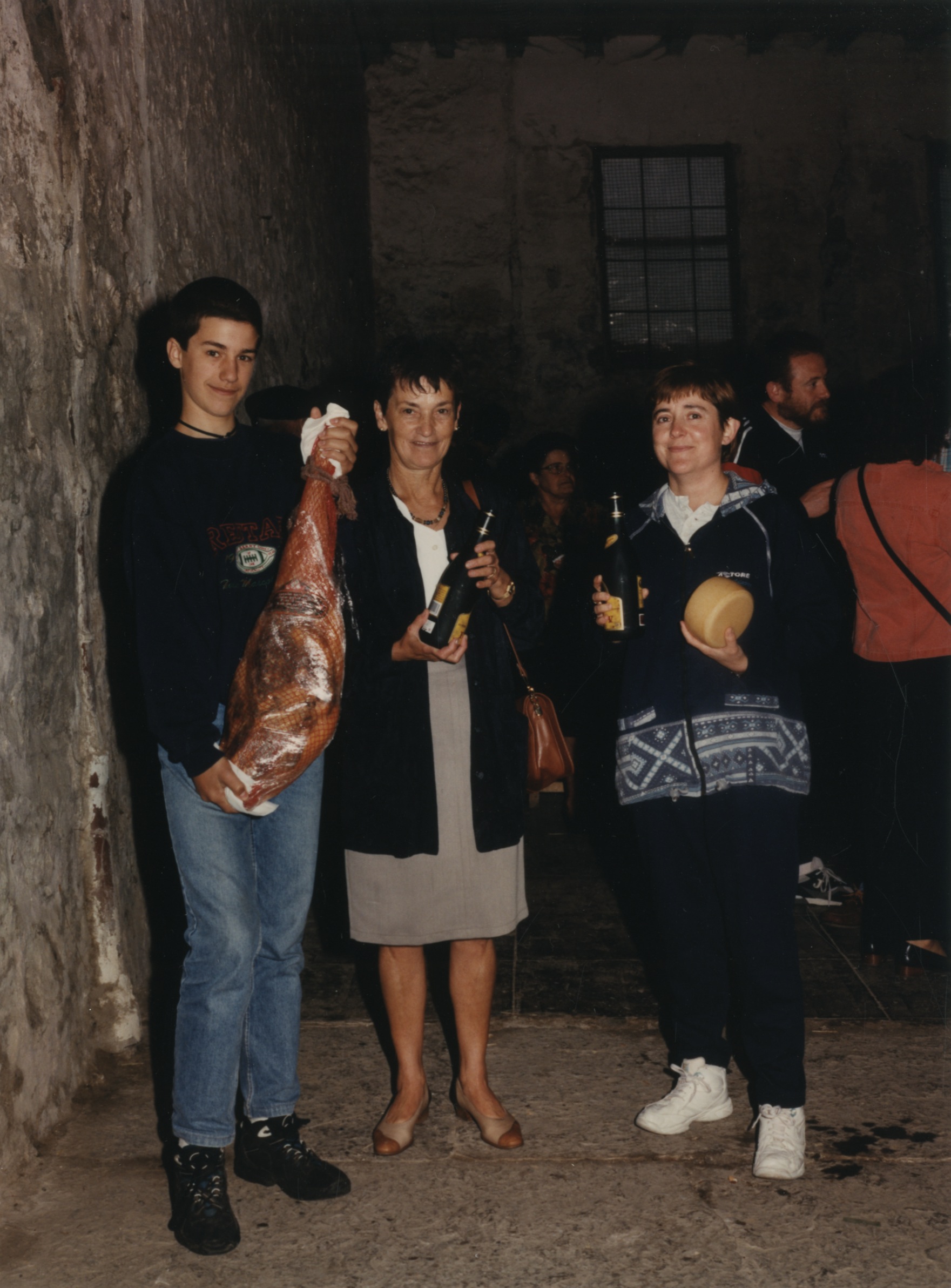 Zozketako irabazleak eskutan urdaiazpiko, gazta eta ardoarekin