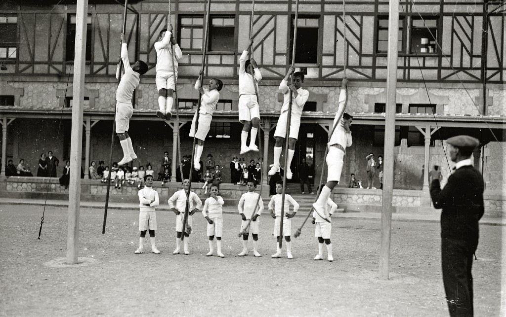 EXHIBICION DE GIMNASIA INFANTIL EN EL PATIO DEL ASILO REINA VICTORIA EN ZORROAGA. (Foto 1/5)