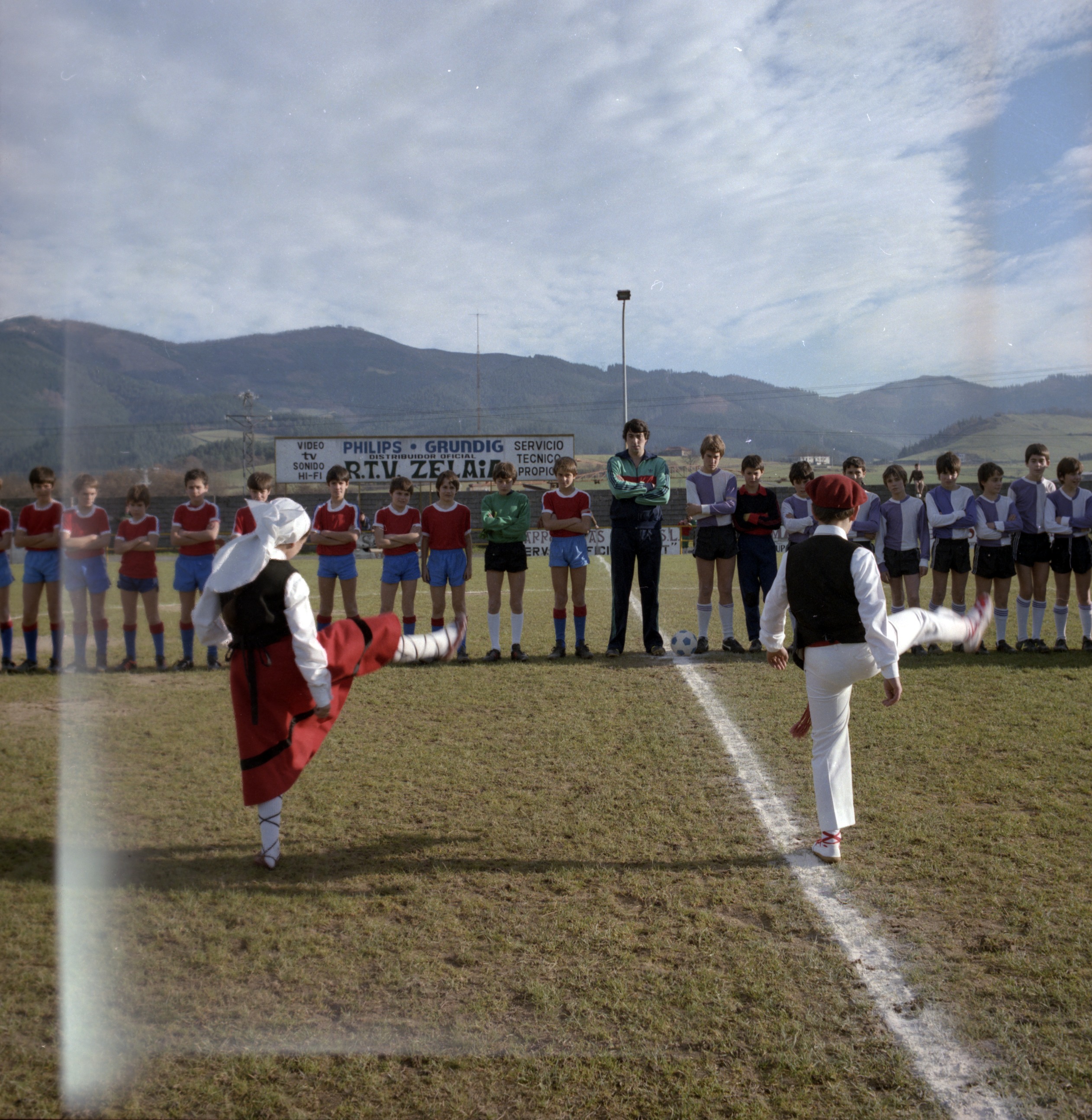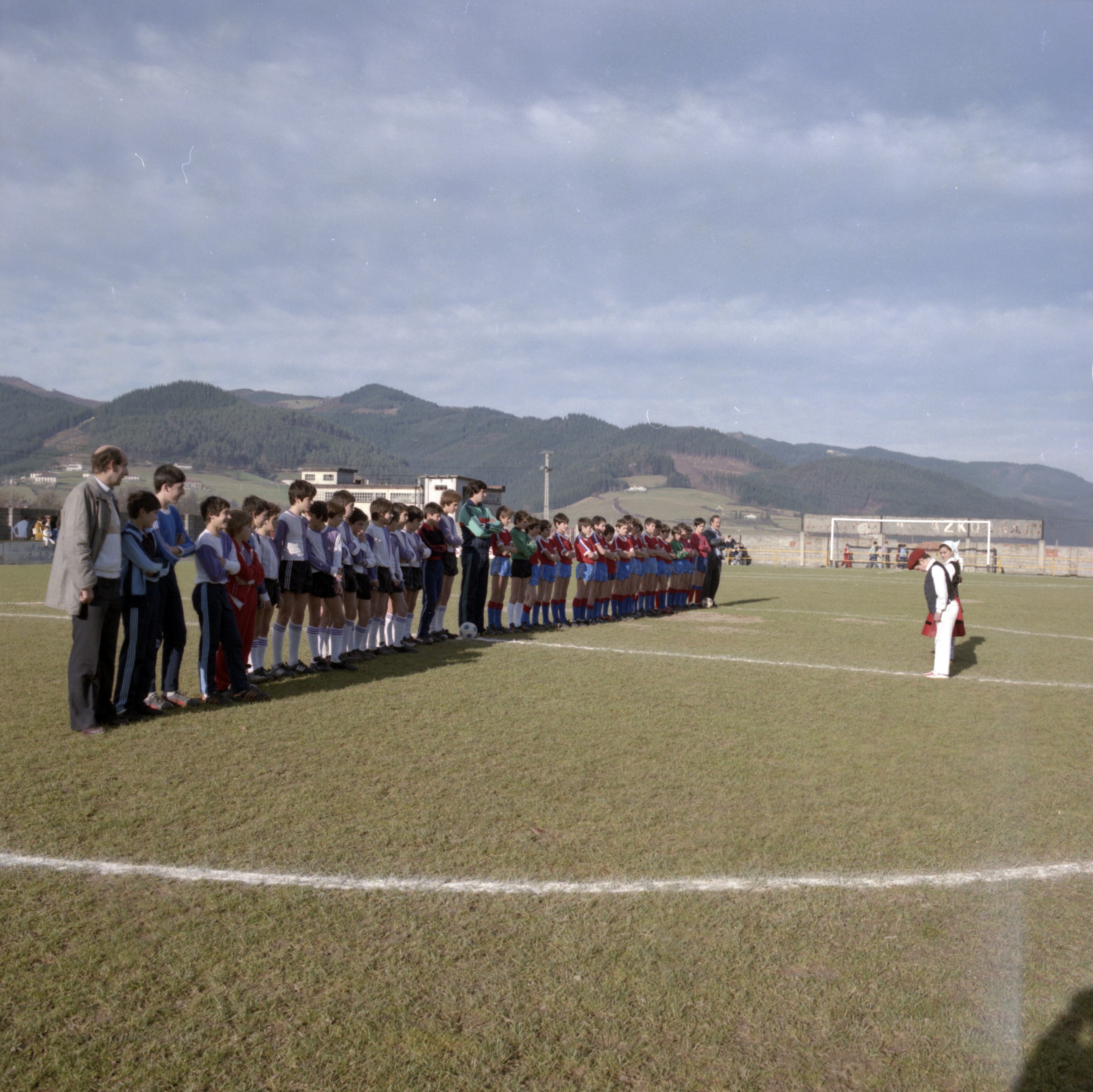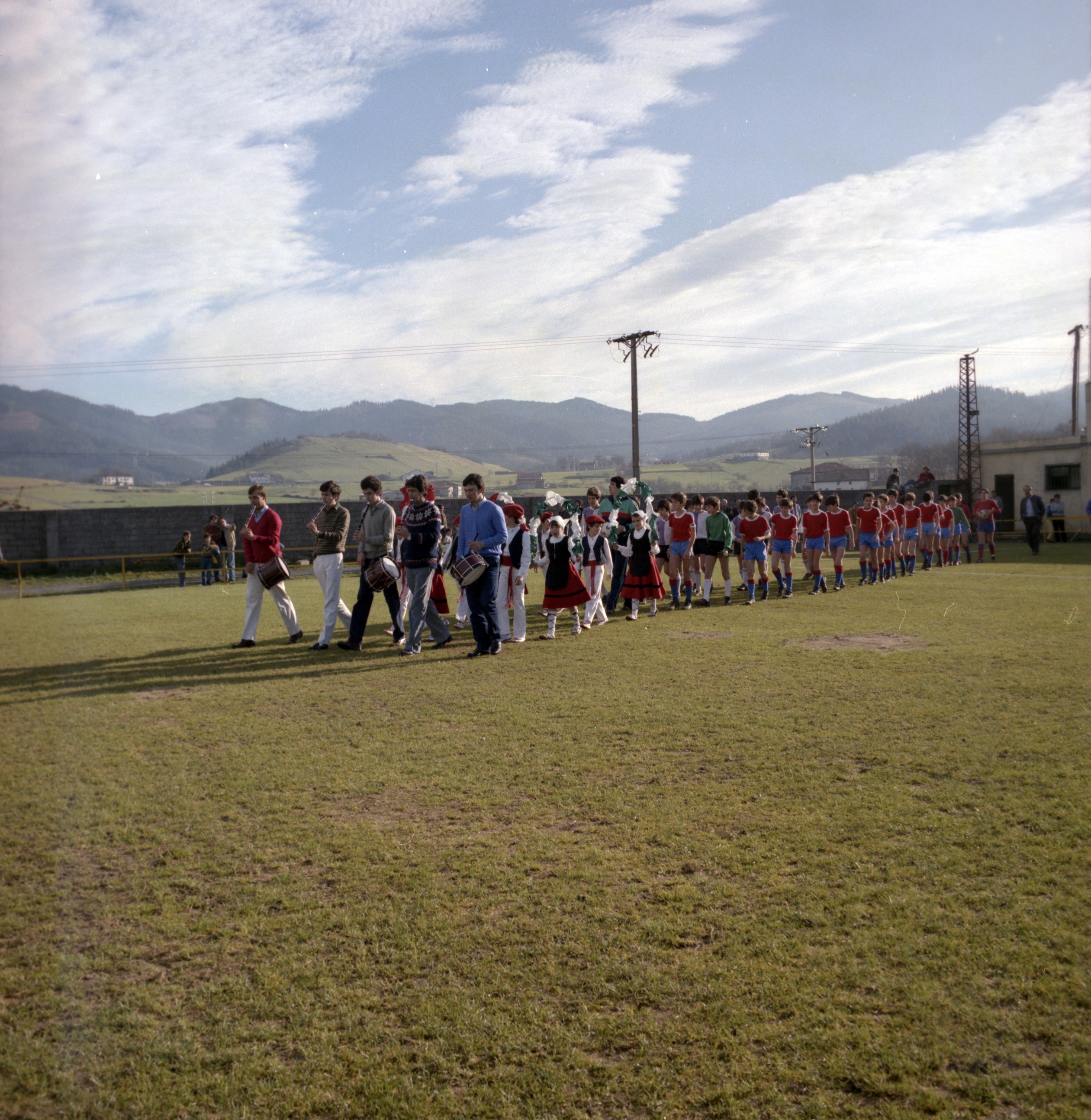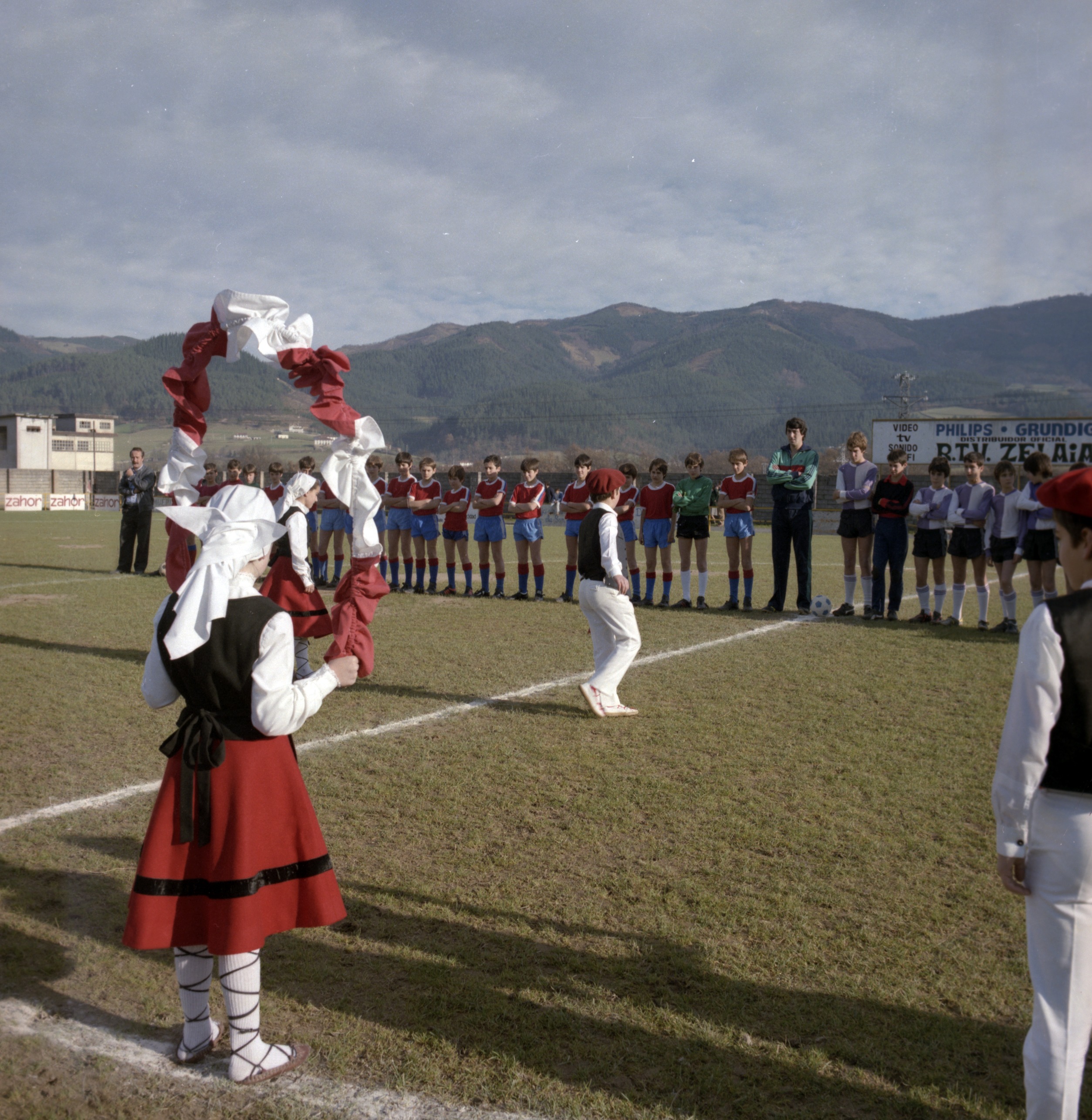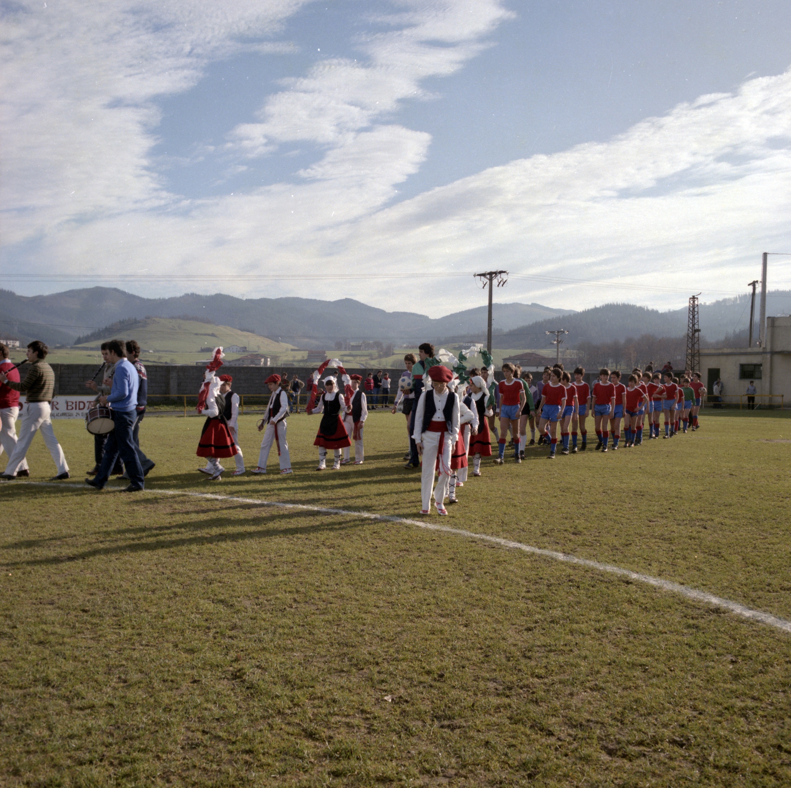 Aloña Mendi futbol taldeko behe-mailako taldea dantzarien laguntzaz kanpo-zelaira ateratzen
