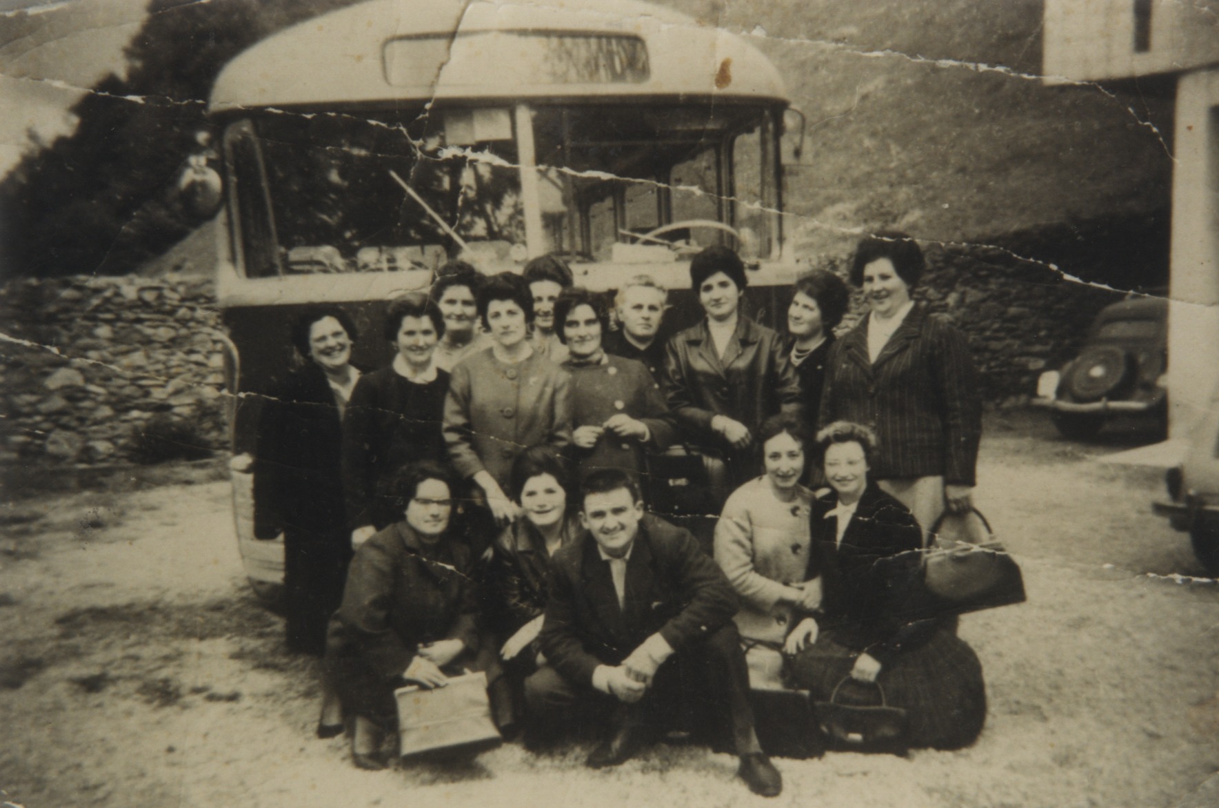 Lagun taldea autobus baten aurrean