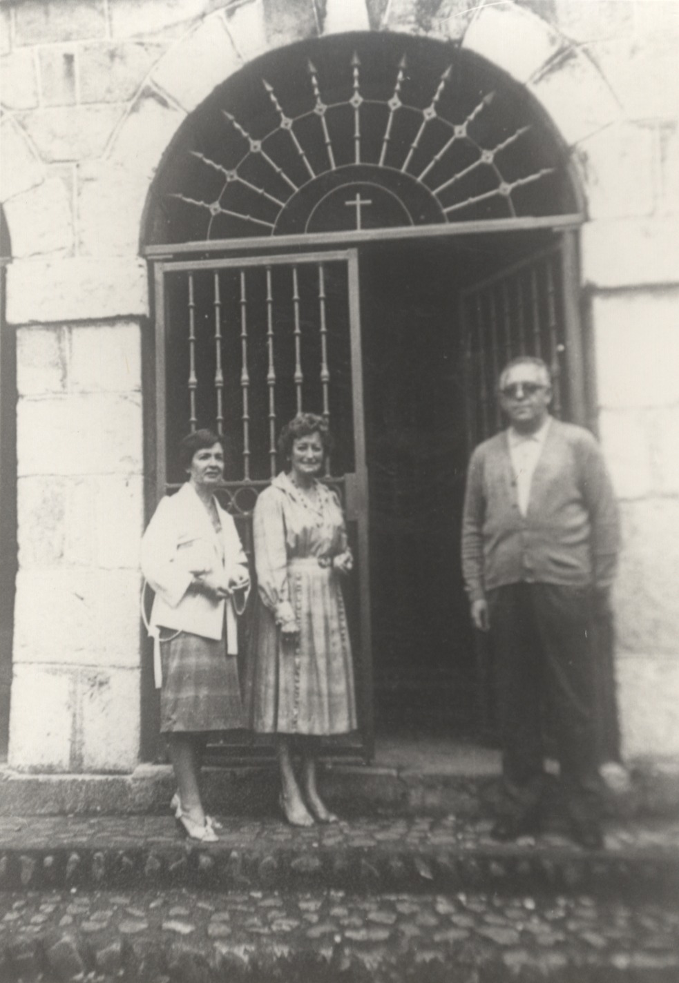 Bi emakume eta gizon bat Santa Leokadia ermitaren sarreran